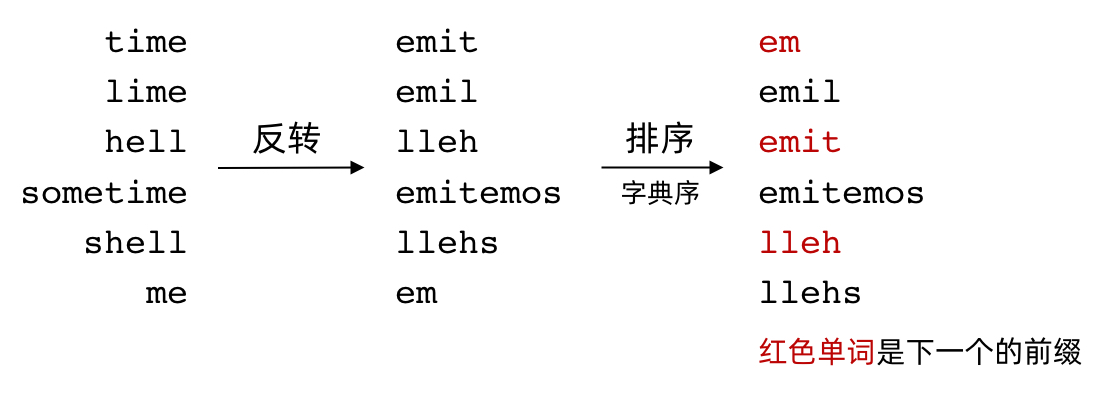 整体的思路就是先把 words 中的字符串反转, 然后按照字典序排序. 这样保证了 reversedWords 靠前的字符串有可能是它下一个的前缀. 所以当这个条件成立的话, 当前这个 word(实际就是个前缀), 就可以被下个 word 吸收, 那当前这个 word 就可以被省略.